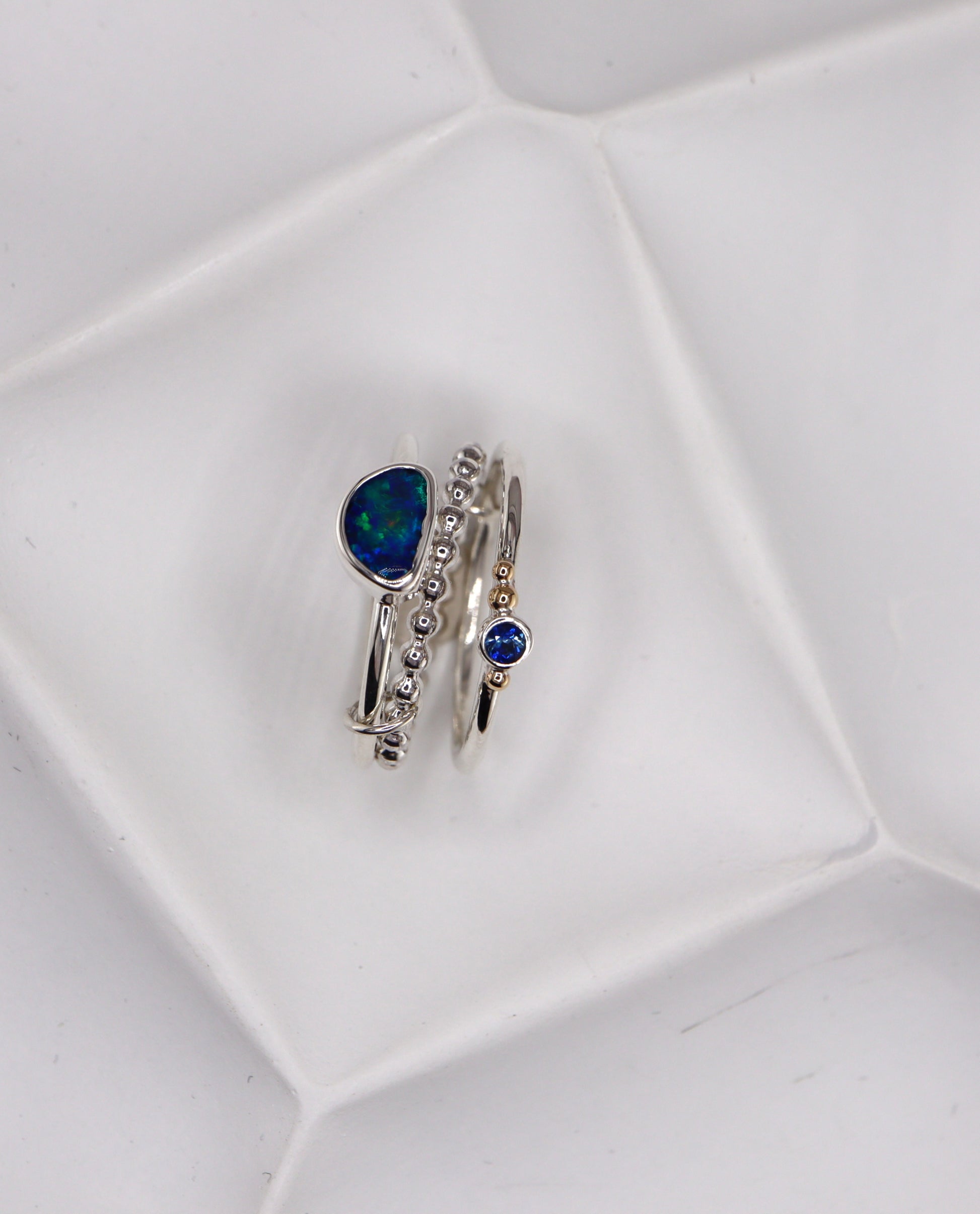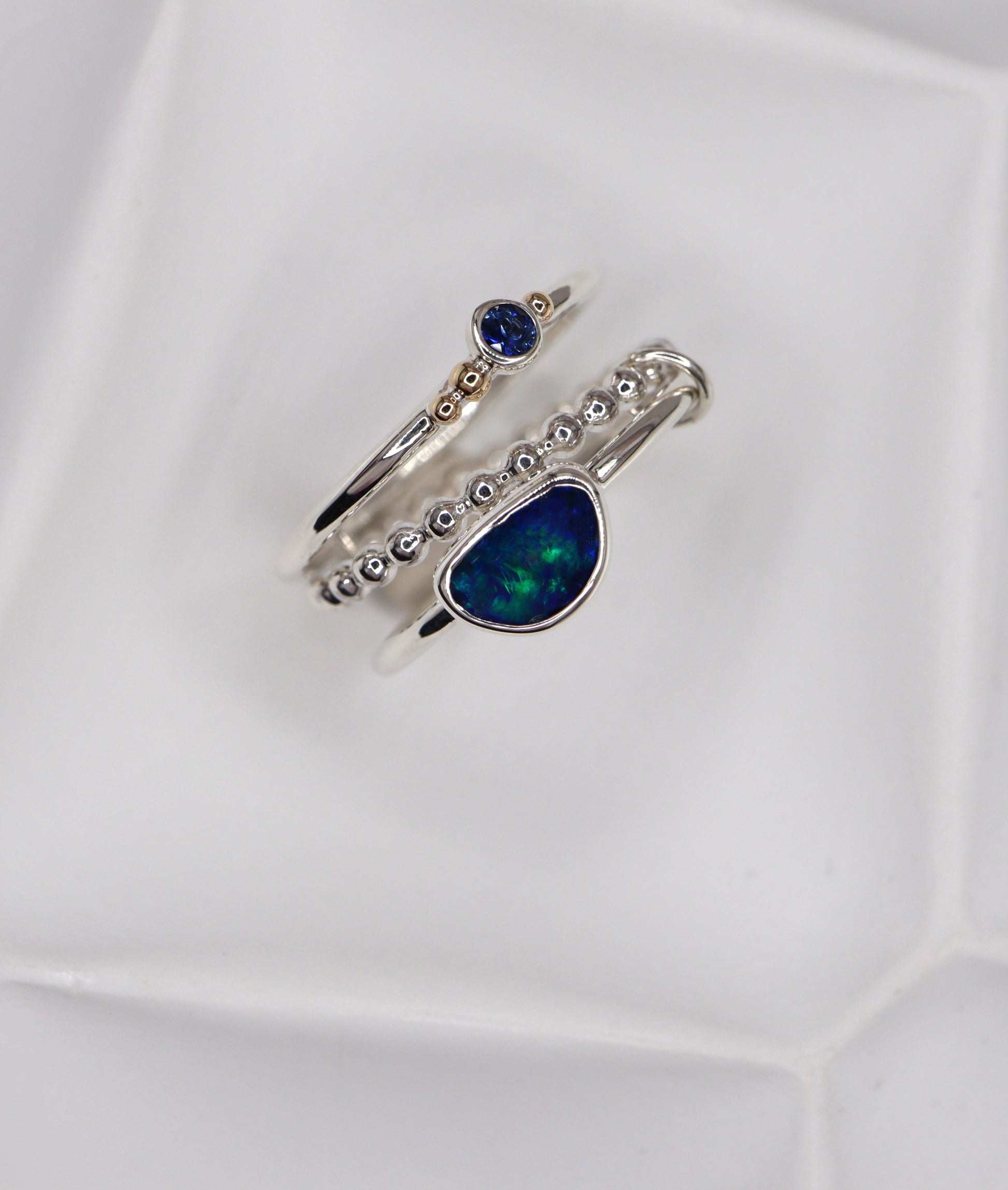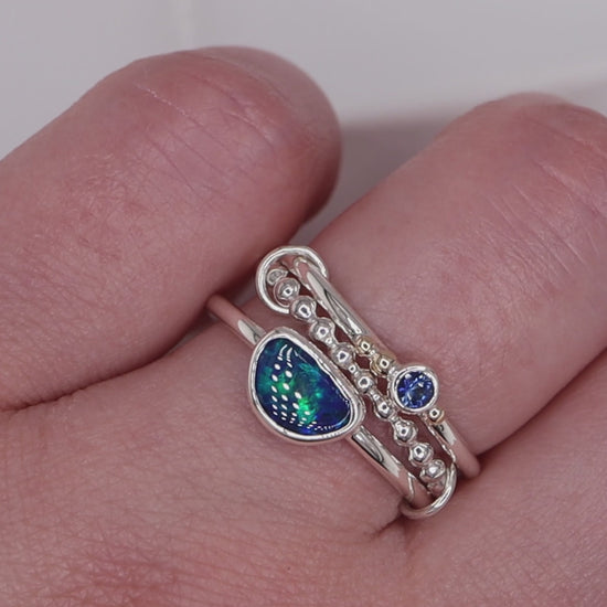 The Eclipse Australian Opal Ring Set is a luminous trio designed to be worn together, creating a layered look full of depth and light. Each ring has been lovingly handcrafted by Alex, carefully shaped and finished by hand to give the set a beautifully organic character that makes it truly special.